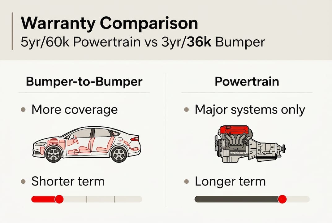 | Coverage varies by type | Bumper-to-bumper covers more systems, while powertrain is limited to propulsion parts. |